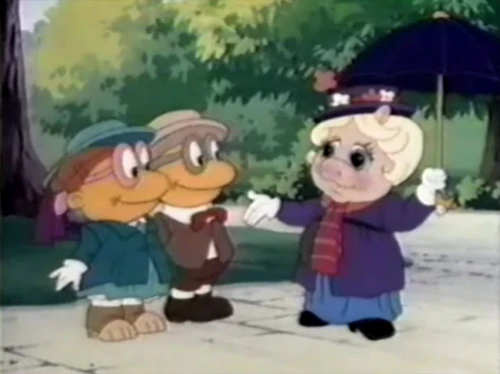 - Baby Piggy imagines herself as Piggy Poppins in the Muppet Babies episode "This Little Piggy Went to Hollywood." She tries to pass on a life lesson to Jane and Michael (Scooter and Skeeter), but can't properly pronounce Supercalifragilisticexpialidocious and gets whisked away by the wind on her umbrella. She makes a visual return in "Plan 8 from Outer Space."