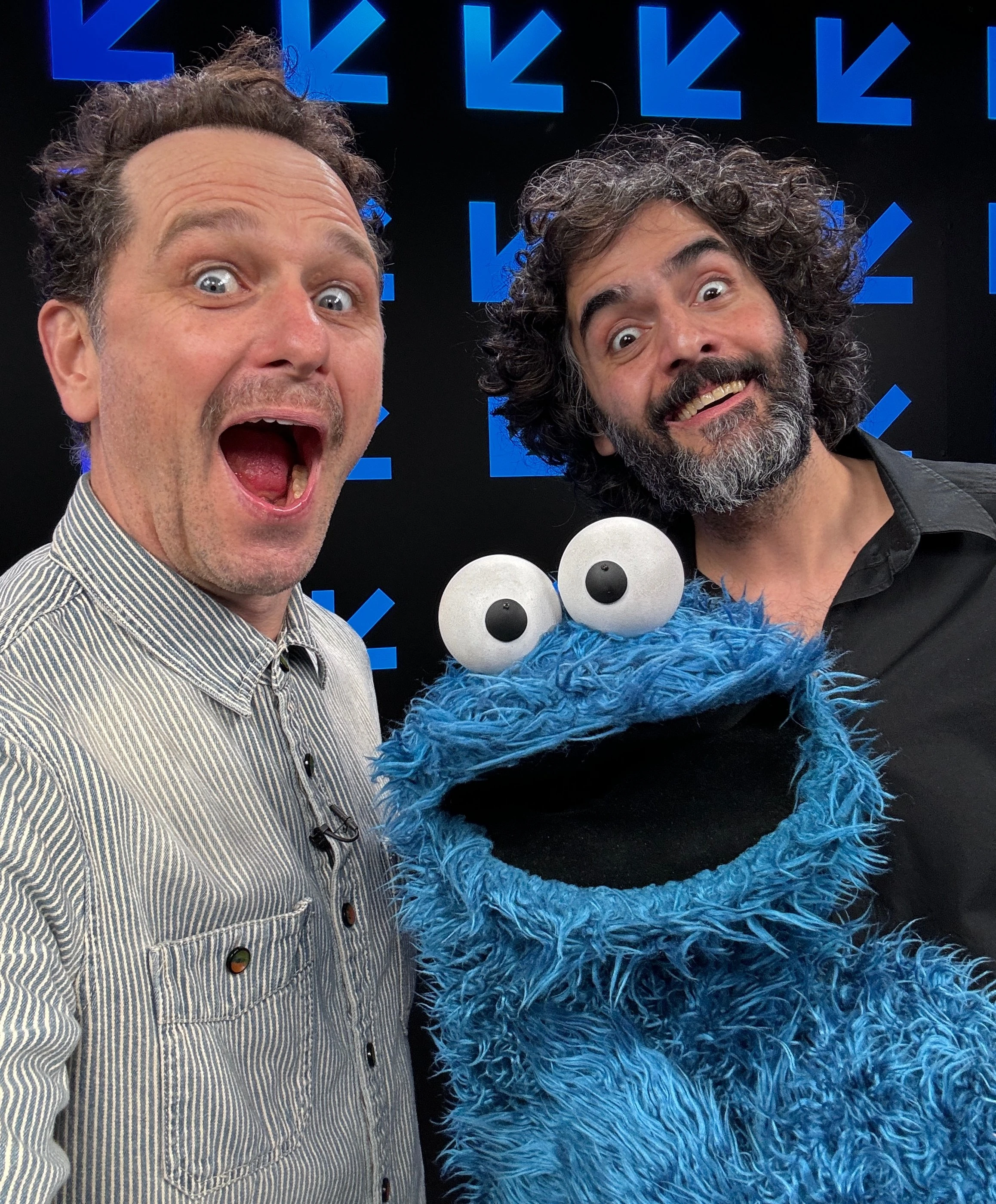 Rhys, left, with Anvari and Cookie Monster