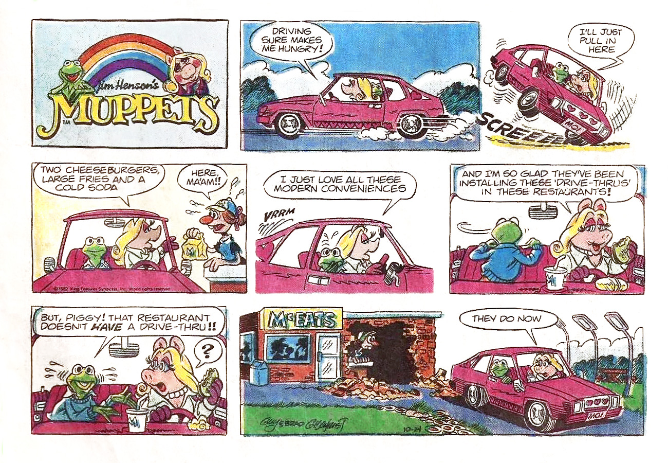 - Kermit and Miss Piggy use a "drive-thru" at McEats in a The Muppets comic strip dated October 24, 1982.