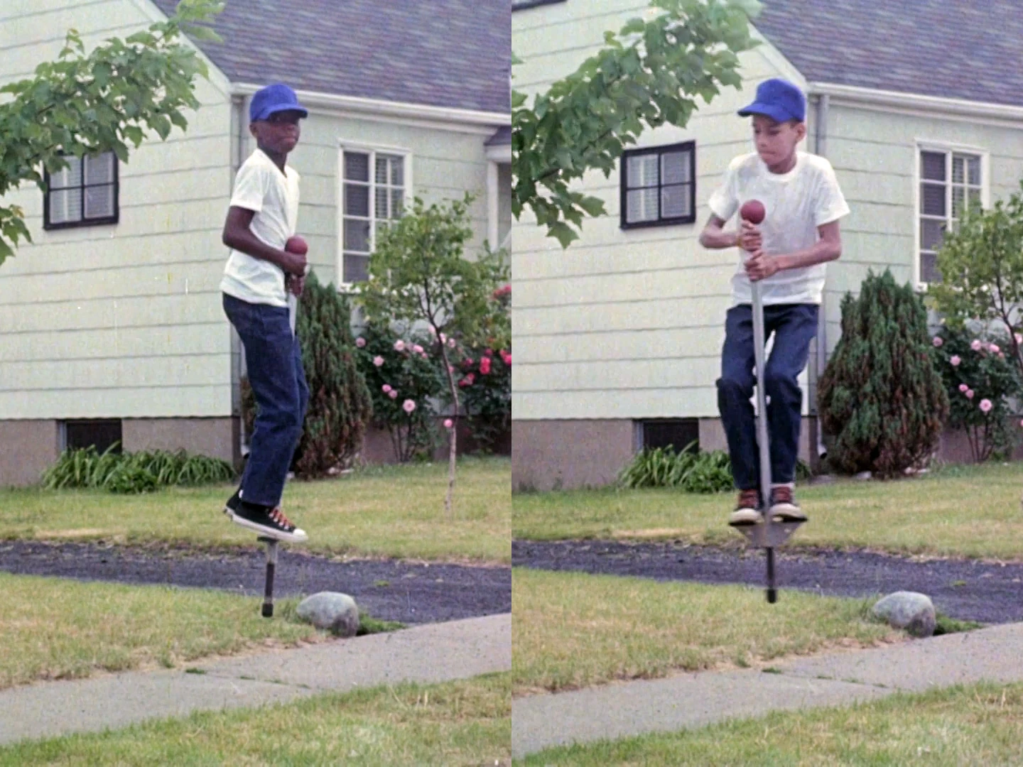 Boy(s) on Pogo Stick | In a quick gag, and part of the recurring pogo stick motif in the film, the Man returns home to find a boy bouncing up and down on a pogo stick. When the man looks again, the boy's skin tone shifts from light-brown to black, as the camera cuts between two child actors. The character then disappears entirely. Paul Schreivogel, in Time Piece: Film Study, interpreted this as Henson's comment on racial integration. Later in the film, a gorilla suit performer is seen on the pogo stick. |