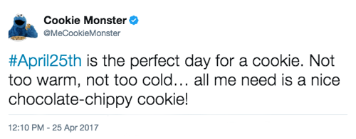 - On April 25, 2017, Cookie Monster tweeted: "#April25 is the perfect day for a cookie. Not too warm, not too cold... all me need is a nice chocolate-chippy cookie!" The tweet is based on a line by Heather Burns' character, Cheryl Frasier ("Miss Rhode Island"), who gives April 25th as a "perfect date" answer during the pageant.