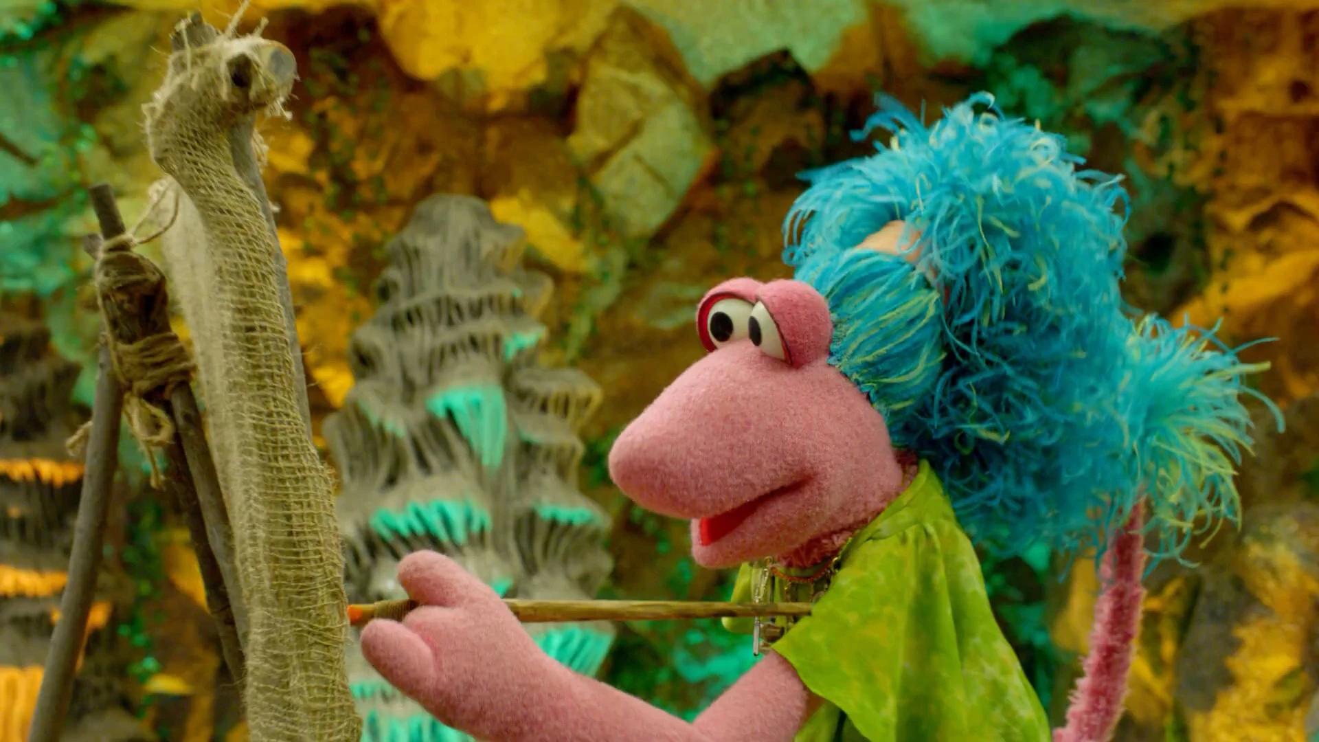 In the revival series, Fraggle Rock: Back to the Rock, Mokey (again played by Kimball) is given a makeover. Her hair is thicker, becomes a vibrant cerulean and is pulled into a bushy ponytail; she wears a necklace with multiple trinkets, her eyelids are raised (with a mechanism that allows them to completely close), and her open robe is replaced with a green blouse. The puppet is also strictly rod-handed. John Tartaglia commented on the design change during a Fraggle Rock Q&A on his Instagram stories, saying, "Mokey is super creative and artistic and she wanted a new look - she's always in touch with the creative vibes of the Rock!"[1] Tartaglia went into more detail about the reasons for the redesign in an interview with MegaPodTastic.[2] Her original outfit is brought up in the episode "I'm Pogey," when Wembley discovers it among her belongings. Mokey explains that she felt it was time for something new, and changed her old clothes and hairstyle as part of her self-expression. In the prerecorded video clips during Fraggle Rock: A Space-y Adventure however, Mokey is shown with her hair down wearing a robe and sweater, similar to that of her original design.