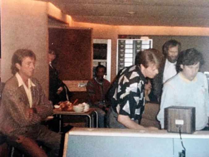 Eric Idle (left) visiting David Bowie and Jim Henson at Abbey Road studios recording music for Labyrinth in April 1985.