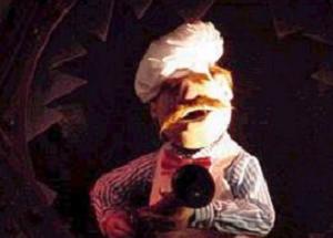 The Swedish Chef takes out a large blunderbuss and shoots at Waldo several times, hitting the screen instead. Waldo teases the Chef, and turns into a target. Waldo then realizes his mistake, as the angry Chef puts the gun away and instead takes out a huge cannon, which is sticking outside the hanging booth in the wall. The Chef fires his large cannon, and the shot is so explosive it practically destroys the inside of the theater.