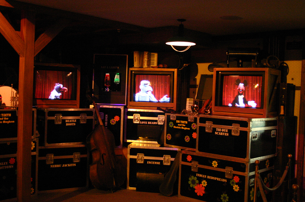 The pre-show film of the Muppets preparing for the main show is presented on four sets of three interconnected televisions situated above the audience in the prop room.