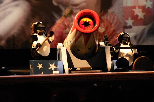 Things begin to go haywire when Waldo accidentally causes one of the musicians to get a tuba stuck on his head and starts running around for help, bumping into others and knocking them over. Bean shoots off the fireworks, and breath-taking fireworks shoot off into the skies, and animations of fireworks exploding appear up on the ceiling. Waldo then appears as a rocket and flies around Miss Piggy outfitted as the Statue of Liberty, causing her dress to fall down.