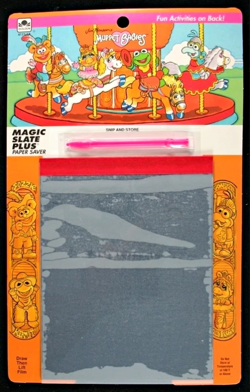Golden Press produced a line of Muppet Babies Magic Slates in 1993. Each slate is a piece of stiff cardboard, with a sheet of cellophane over a soft waxy surface on the front. Using the included red plastic stylus, a child can draw on the cellophane, and then lift the page to erase and start over.