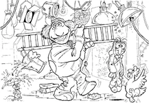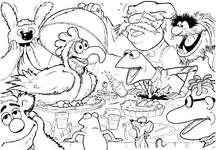 Characters include Fozzie Bear, Miss Piggy, Gonzo, Kermit the Frog, Robin the Frog, The Swedish Chef, Animal, Beauregard, rats, Camilla the Chicken, Thog, Rowlf the Dog, Gaffer, The Muppaphone, Scooter, pigs, Sweetums, Beaker, Foo-Foo, Dr. Teeth, Zoot, Janice, Floyd Pepper, Lips, Statler and Waldorf, Lew Zealand, Annie Sue, and Dr. Bunsen Honeydew.