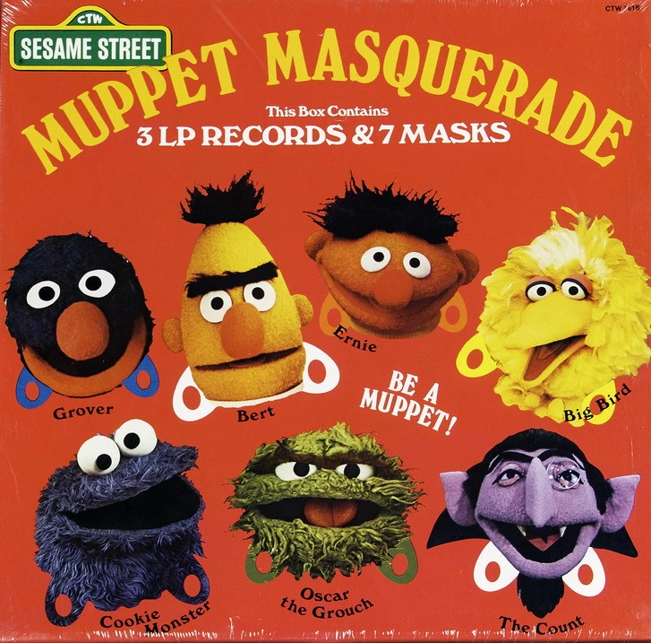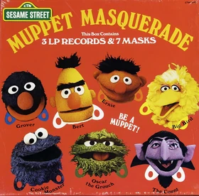 Muppet Masquerade is a 3-LP set of Sesame Street songs from the first nine years of the show. The set also includes cardboard masks of Ernie, Bert, Big Bird, Grover, Oscar the Grouch, Count von Count and Cookie Monster. Each character gets a side's worth of songs (except for Ernie and Bert, who share Side One of Record One). The listener can put on the masks and, as the front cover suggests, "Be a Muppet!"