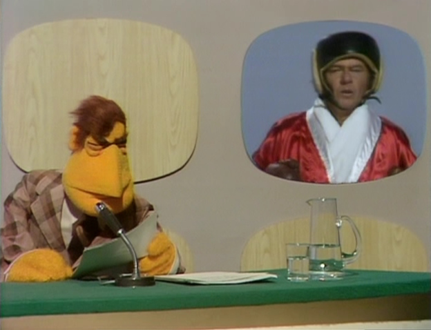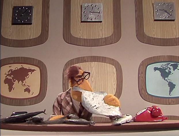 The Newsman reports that security at Muppet News is so tight that rumors cannot be reported to Muppet News. The Newsman then reports that a black-and-yellow striped mackerel has been elected king. The Newsman doesn't believe it until he meets the king. | |
