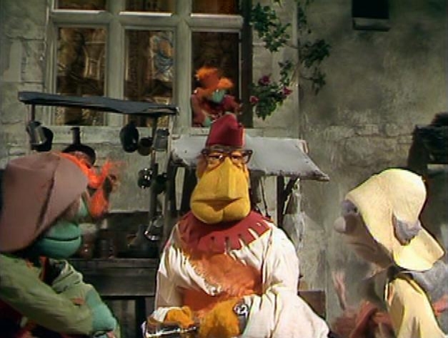 The Town Crier calls out "5:00, and all's well! Except that Maid Marian has been kidnapped, the Sheriff's up to no good, that dog is stealing the cheese, Kermit's mad at Piggy, and it's really only 4:30." He then gets hit with a falling pot. | |