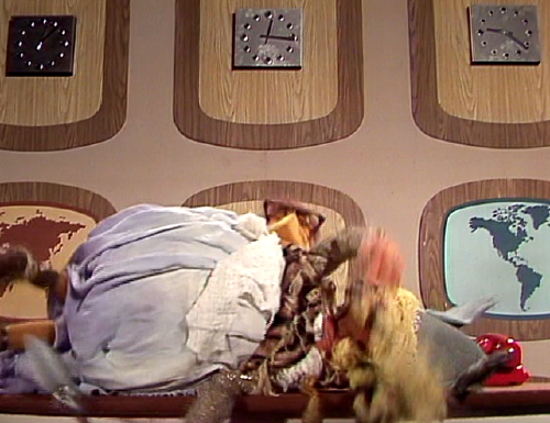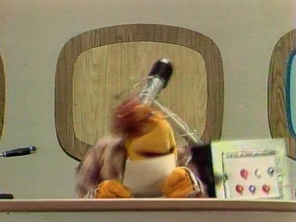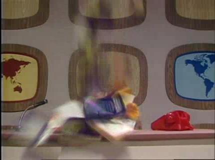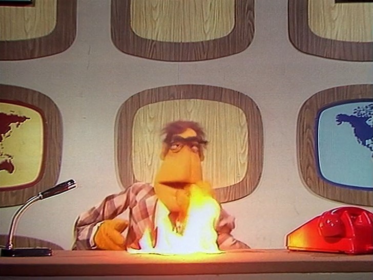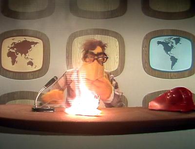 The Newsman declares that "This is a Muppet News Flash," upon which his desk explodes. | |
