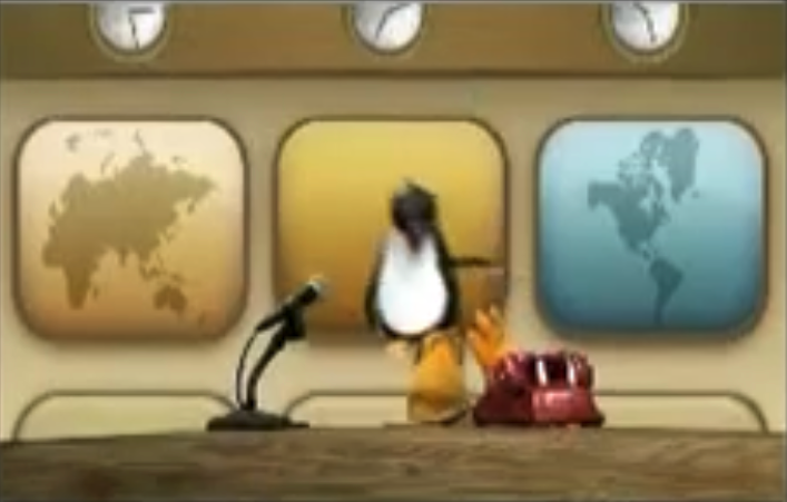 The Newsman gives a weather report. He says it will not rain "like cats and dogs", then penguins start falling from the sky and hitting him on the head. | |