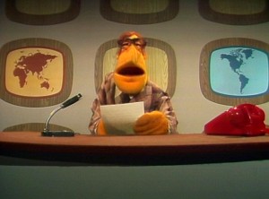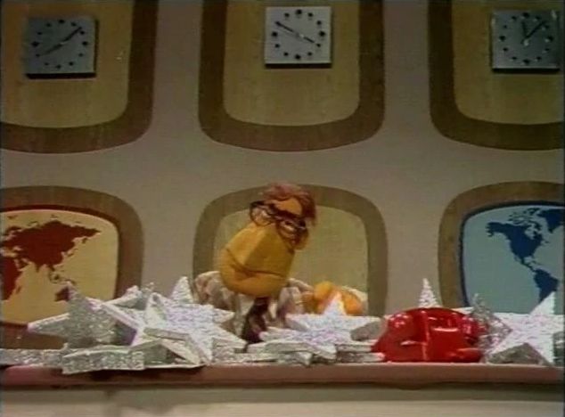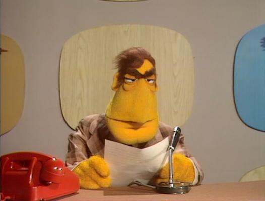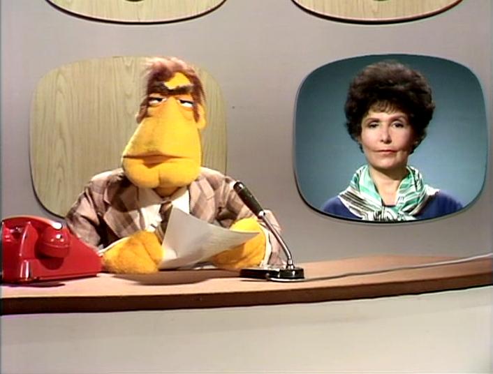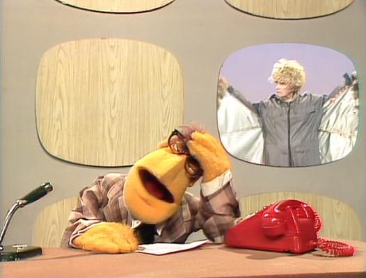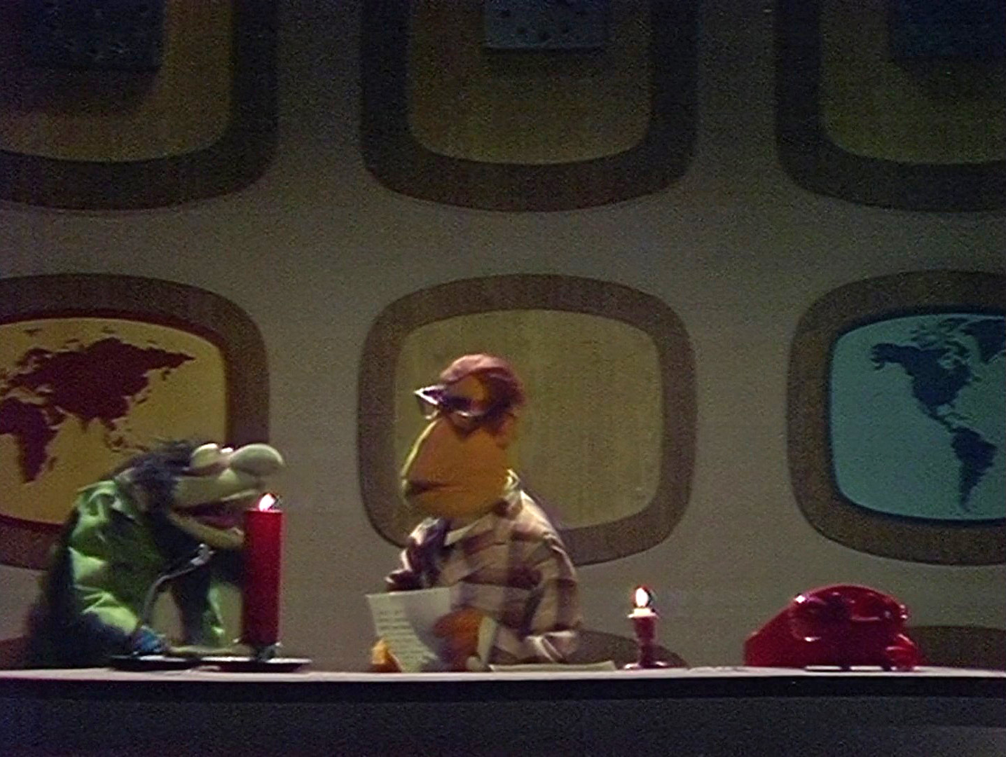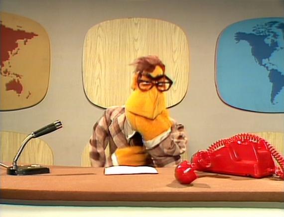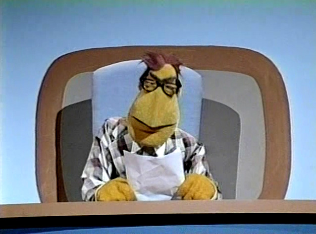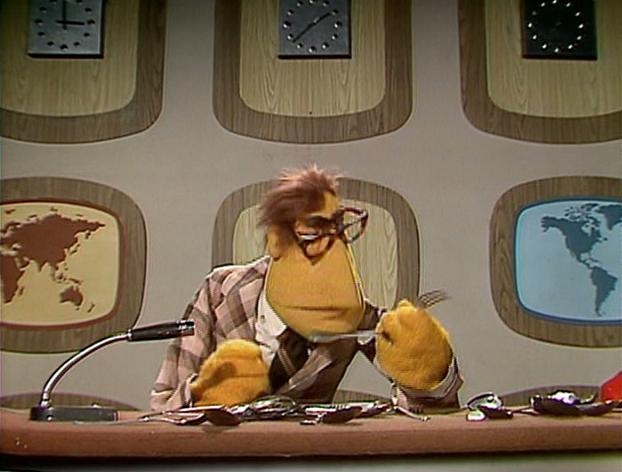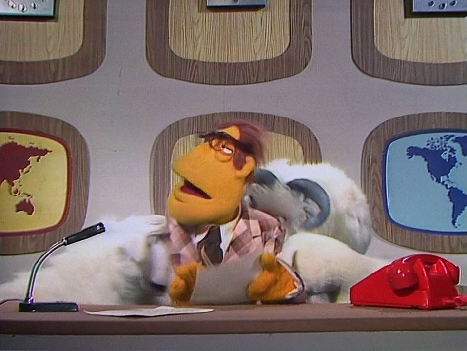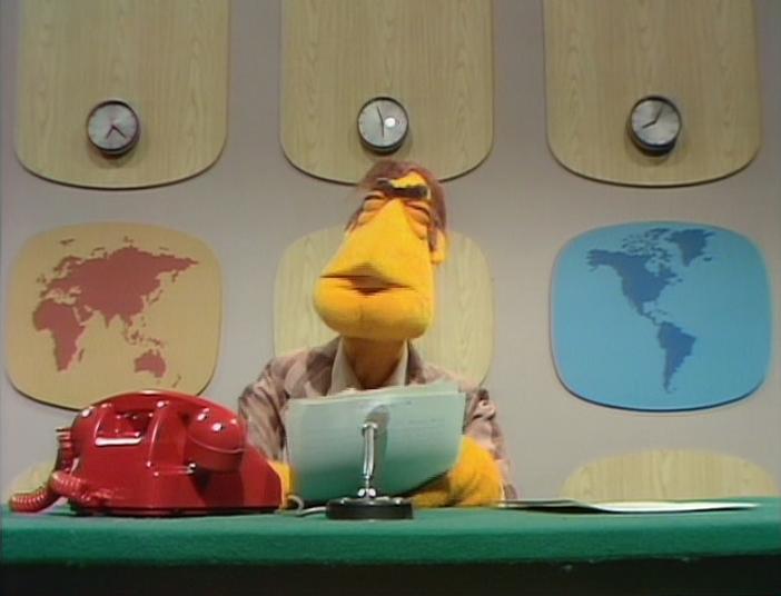 The Newsman announces that he is retiring and this would be the last time he is reporting the news. The news story he reports is that Muppet Labs has perfected a cloning process and can make a clone of someone immediately. With that last news story, The Newsman says good-bye and weeps as he leaves. | |