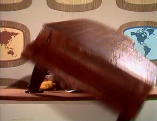 The Swinetrek has made a soft landing on a distant planet, while Venus is about to make a hard landing on the Muppet newsroom. Then the Venus de Milo statue crashes on his desk. | |