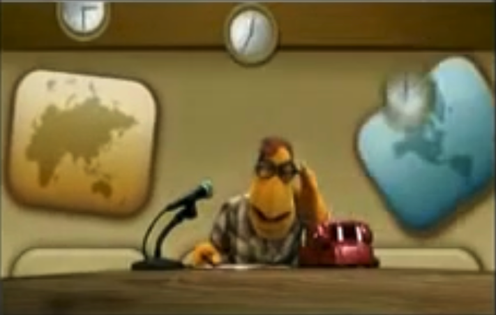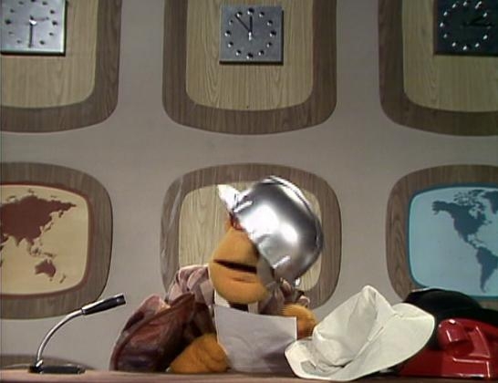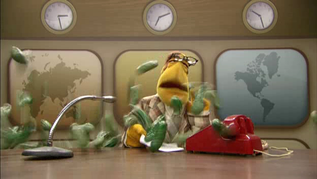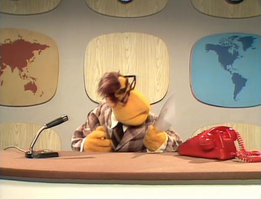 The Newsman announces that giant meteors are falling from the sky and are reported to be explosive and dangerous. He gasps and quickly ducks under his desk, but nothing happens. He gets back up and continues with another news about genetically-engineered flying elephants who have escaped from Muppet Labs and will squash anyone who mentions their existence to death. The Newsman gasps and quickly ducks under his desk again, but nothing happens. Suddenly a blue monster hand gives him a note and the Newsman reads it. He reports that anyone who reads this sentence would turn into cheese. The Newsman suddenly turns into a cheese and rolls off the desk.
