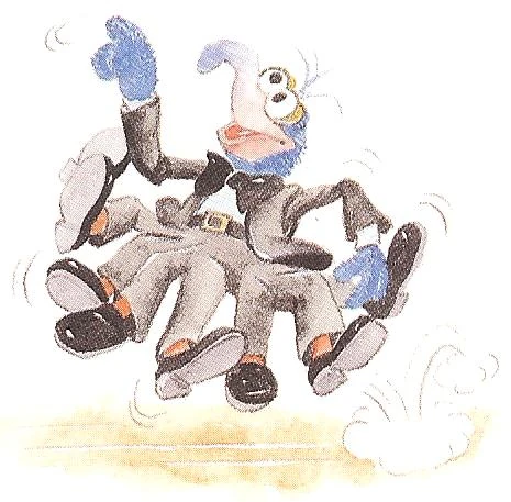 At the Ball, Gonzo hangs out against the wall, while everyone dances to the music of Fearless Frank's Caroling Cockatoos. When the band starts their big hit, "When the Red, Red Robin (Comes Bob, Bob, Bobbin' Along)," Gonzo perks up as it is his favorite song. Soon he finds his toe tapping and his head bobbing to the music, and before he realizes it he runs out to the dance floor to twirl, hop and skip. Miss Piggy tells him that he is indeed a fantastic dancer, and asks him to teach her the dance, and soon everyone there is doing the "Hip-Hop, Clip-Clop, Bop-Till-You-Drop-Dance." |