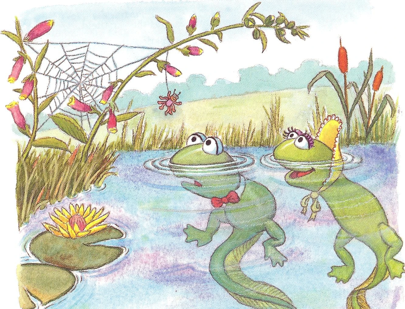So Thomas waited and waited, and each day Lolly would tell him of more magical things around him. Rainbows in the sky, or flowers growing. And every day the duo began to change, with their legs growing stronger and their heads getting bigger, until one day they were no longer polliwogs, but little frogs instead. |