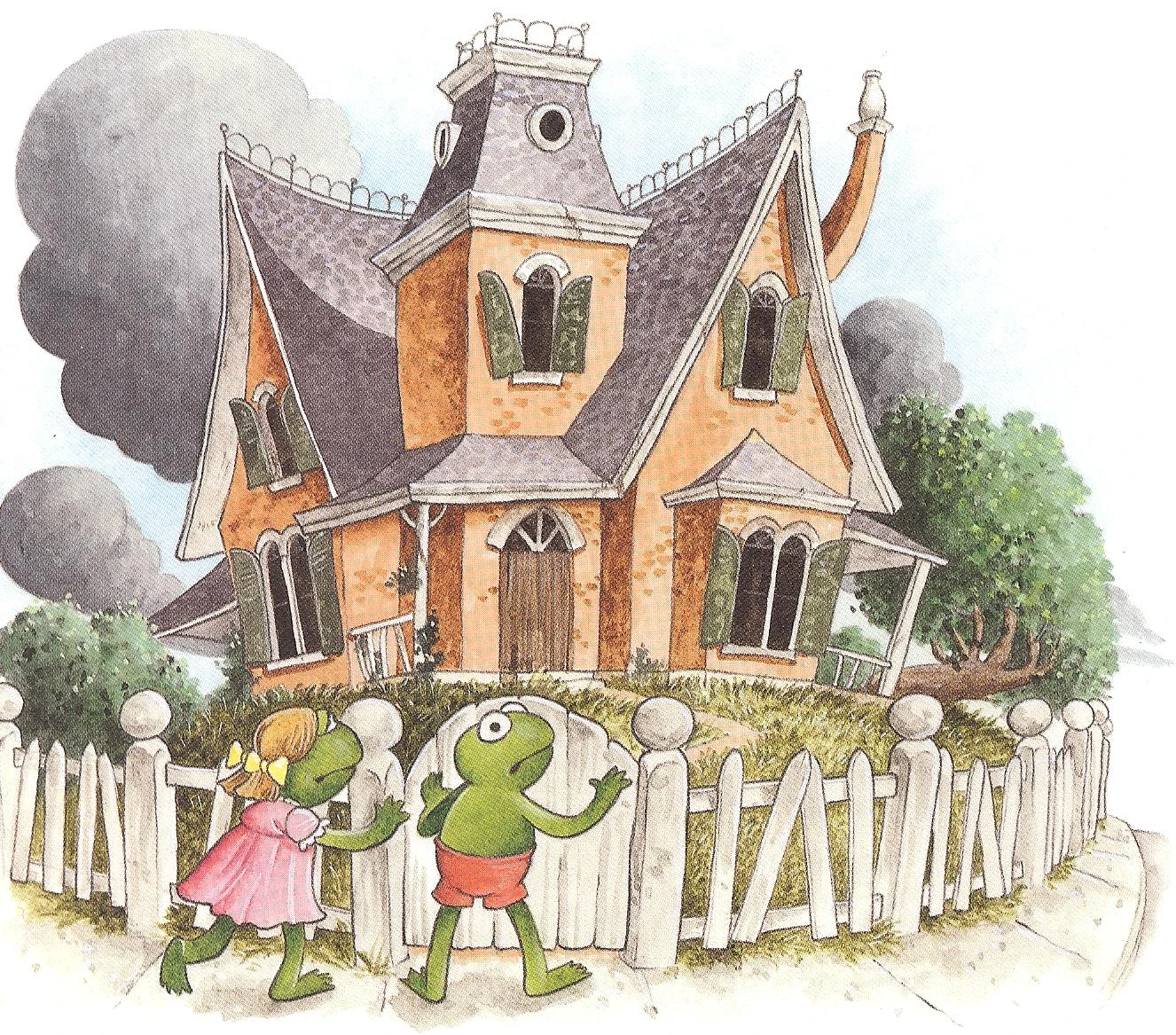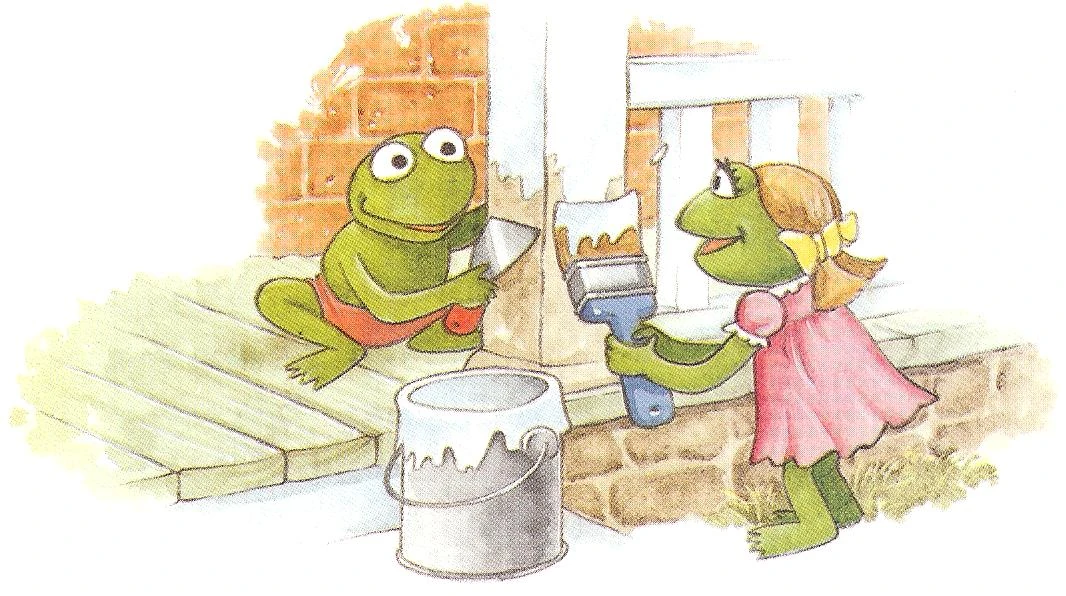 Startled, Robin begins to run, but soon sees that a tiny wrinkled old lady has answered the door, asking how she can help him. Shocked, Robin says that he and his friends thought that maybe she could use a hand around the house. Delighted, Mrs. Bigelow informs Robin that she has many things that she needs help with, for she cannot do them by herself anymore. So every day after school, the little frogs pull weeds, mend the fence, and paint the porch. Happy to have the company, Mrs. Bigelow treats them to hot apple cider and peach cobbler, and soon the house is all fixed up. |