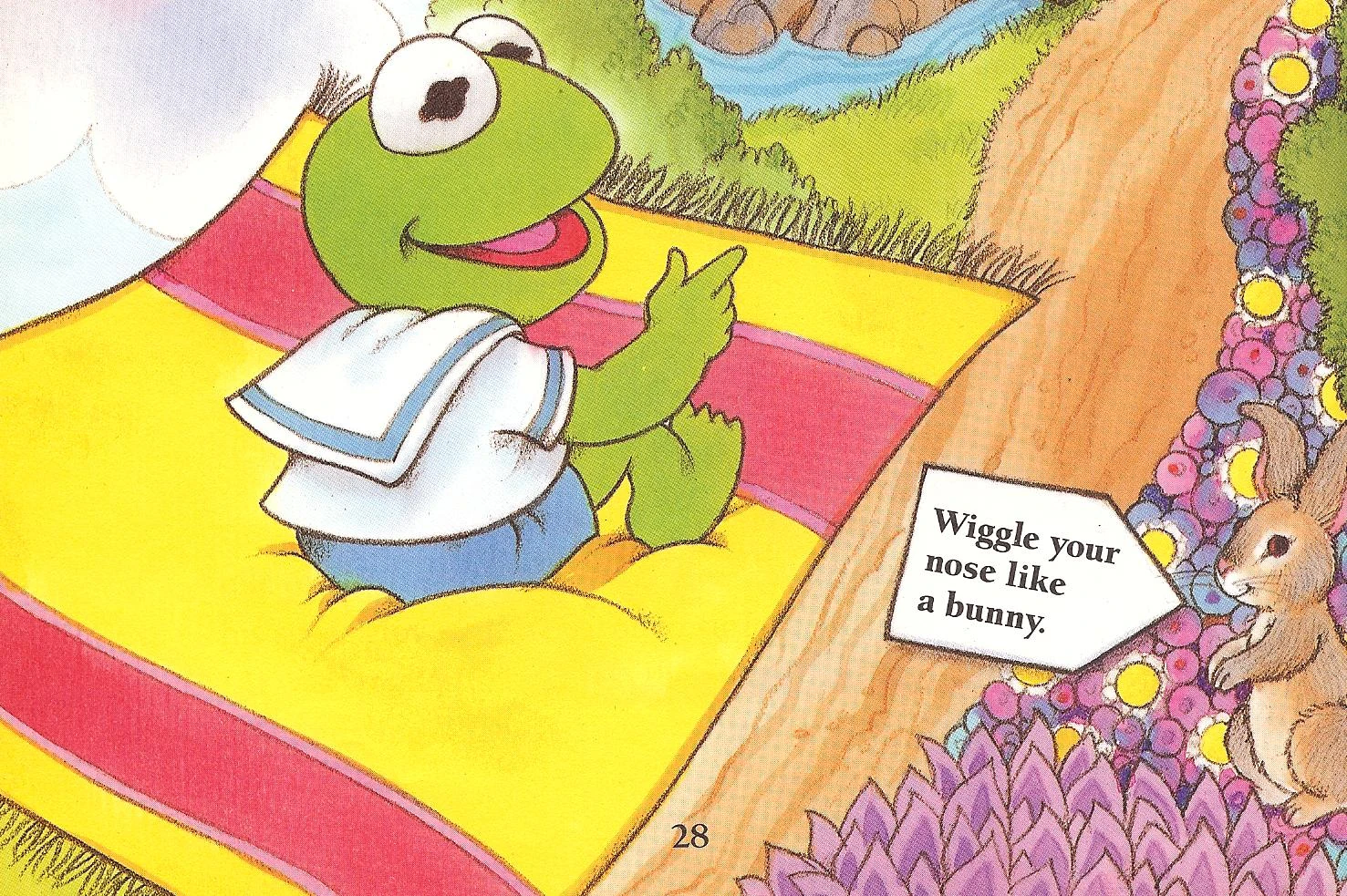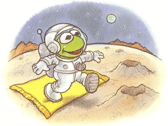 As the blanket rises higher and higher, Kermit soon finds himself on the Moon, having fun with the lack of gravity and moon rocks. Soon he becomes hungry, and thinks that they best be getting back to the Nursery. When they arrive, Nanny announces lunchtime, and the Babies tell Kermit he's missed all their fun, but he knows that his blanket and he had not. |