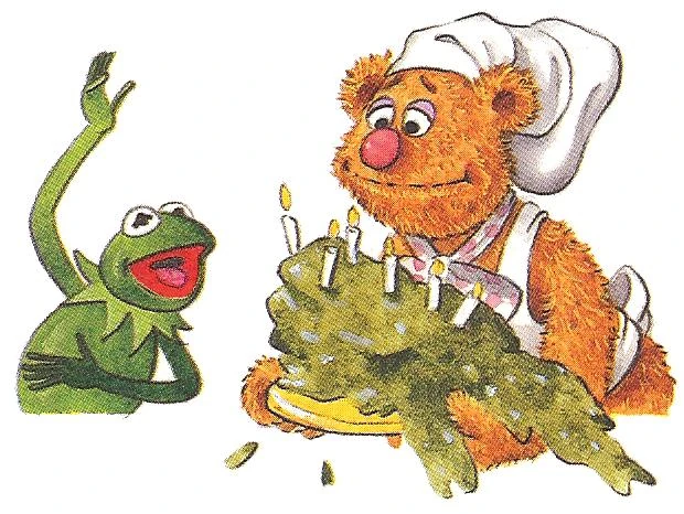 Not knowing how to bake, Fozzie's attempts at cooking are less than stellar, with him using marshmellows to make the eggs fluffy, and cherry cola in place of baking soda. When the cake is finished, its five layers were lumpy and lopsided, with the frosting looking like green slime. Piggy decides they should call it a Swamp Cake and serve it anyway. When Kermit sees the cake, he believes it is the Swamp Cake his mother used to make. Unfortunatly it did not taste like his mom's cake at all. However, the friends are supportive of Fozzie's attempts, and he promises that he's practice so that next year he can make a Super Duper Really Truly Boffo Birthday Cake. |