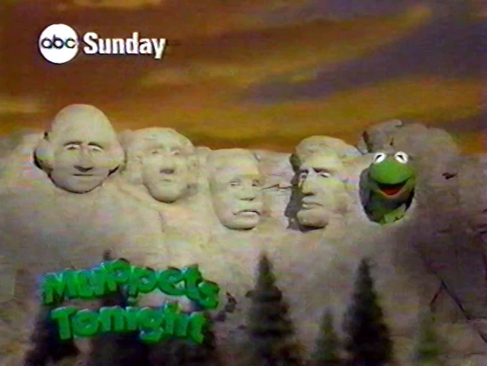 As the camera scans past the heads of Mount Rushmore, an announcer (Bill Barretta) states that America needs a figure to lead them to "a brighter tomorrow." Kermit is then seen popping out the side of the mountain, delivering a "Hi there!" |