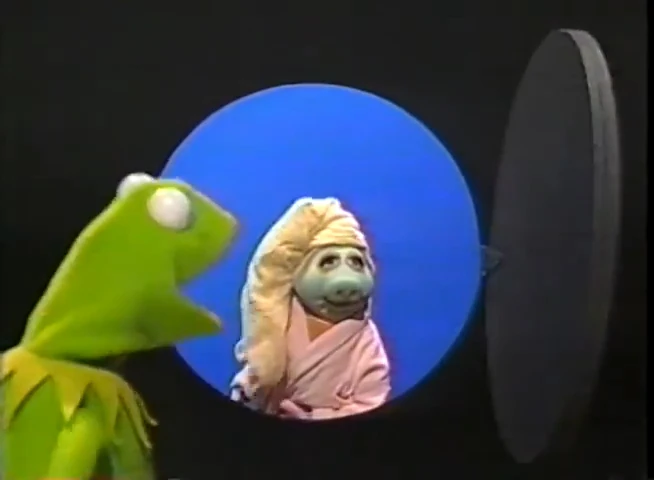 Kermit announces that Muppets Tonight is coming soon. The ABC logo opens like a door to reveal Miss Piggy in a robe and beauty mask, and Kermit says they're not quite ready. | ||