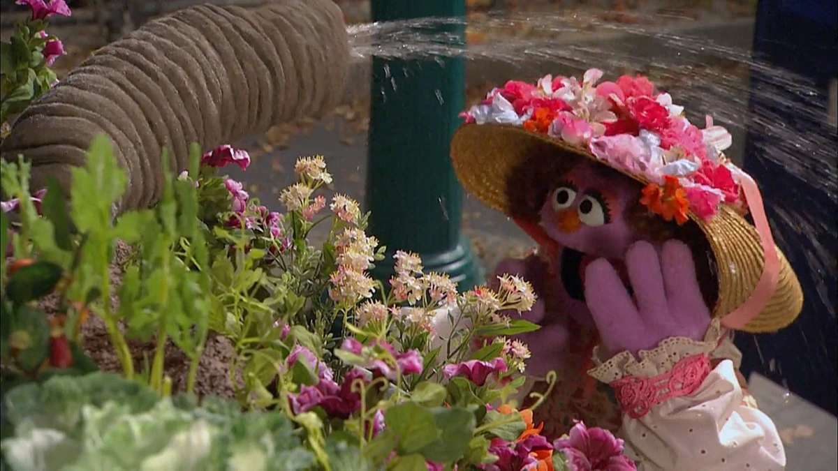 Grover attempts to water a garden, but ends up spraying himself with the hose. |