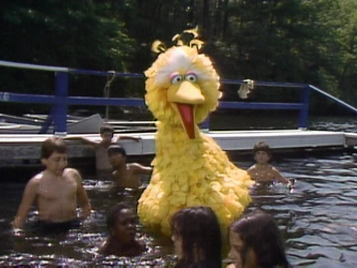 Big Bird goes swimming in the Camp Echo Rock lake. |