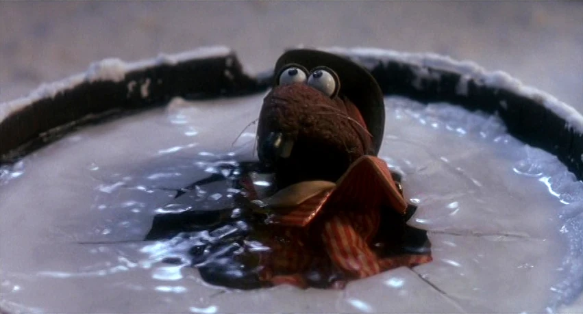 When Rizzo's tail is accidentally set aflame, Charles Dickens puts him out by pushing him into a bucket of water. |