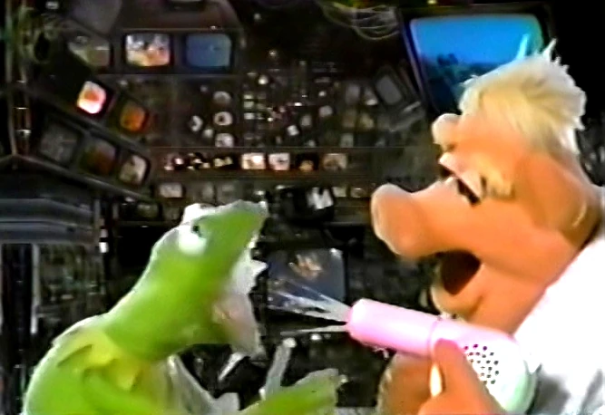 Lindbergh repairs the MuppeTelevision water and electrical lines and finds the idea amusing if he has mixed them. Soon after, Link Hogthrob report to Kermit that his hair dryer is malfunctioning - it sprays water instead of air and soaks Kermit. |