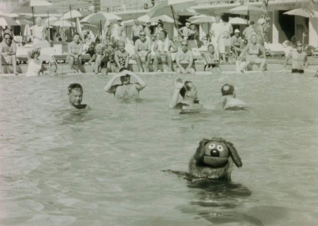 Rowlf the Dog, having joined IBM's Hundred Percent (quota) Club, is shown enjoying some time in a hotel swimming pool, and then swimming at the beach. |