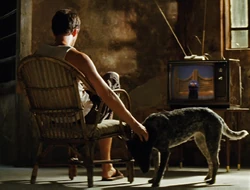John and his two sons are shown watching Sesame Street on TV featuring a segment with The Amazing Mumford and Cookie Monster. Trying to get his son to engage with the programming, John asks him, "Who's that? Is that Big Bird? No. Who's that? Is that Cookie Monster? Me want cookie! Is that Cookie, huh, Dylan?" |
