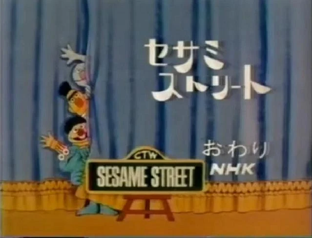 In the early 1980s, an original closing credit sequence ended each episode. The first one points out of a companion book/guide that is available, along with a mailing address and pricing options, followed by a cast list. These credits also depicted illustrations of the Muppets, some holding numbers and letters, and was accompanied by the theme (one from the Original Cast album, though it cuts off to the last few notes of the closing harmonica solo). Characters seen include: The Count, Sherlock Hemlock, Professor Hastings, Big Bird, Oscar the Grouch, Cookie Monster, Ernie, Bert, Kermit the Frog, Grover, Roosevelt Franklin, Herry Monster, The Amazing Mumford, and an Anything Muppet old woman. The entire sequence ends with a shot illustration of Cookie, Ernie, Bert and Grover poking out of a curtain with the Sesame Street sign (and its Japanese translation above) and the NHK logo. (This illustration was also used at the end of 1976-1977 episodes of "Sesamstraat" with the Sesamstraat sign and the BRT and NOS logos.)