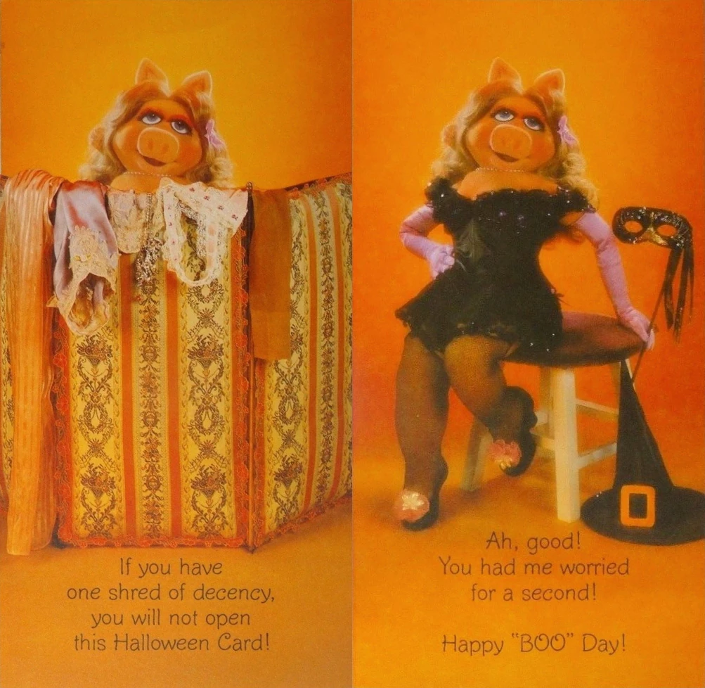 - A 1982 Hallmark greeting card features a photo of Miss Piggy on the cover, peeking over an antique privacy screen (used to undress and change clothes) that has been draped with various undergarments. She teases, "If you have one shred of decency, you will not open this Halloween Card!" On the inside, Piggy is revealed to be wearing intimate attire with a mask and witch's hat as accessories. Positioned provocatively on a stool she adds, "Ah, good! You had me worried for a second! Happy 'BOO' Day!"