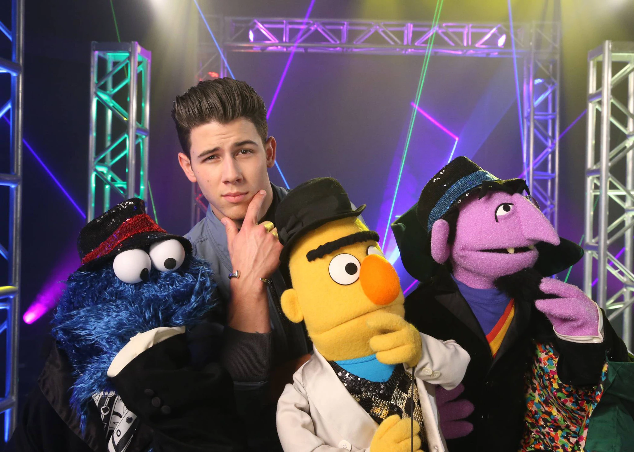 Nick Jonas with Cookie Monster, Bert and Count von Count on Sesame Street.