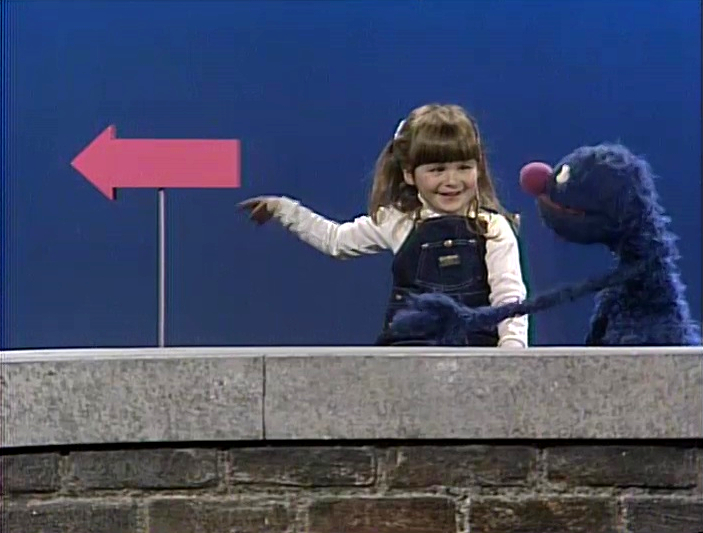 Muppets | Muppet & Kid Moment — Grover asks Maya to help him follow an arrow. The arrow changes direction until Grover falls down, exhausted. (First: Episode 1641) The player can press the white button to make the arrow graphic match the one on-screen. |