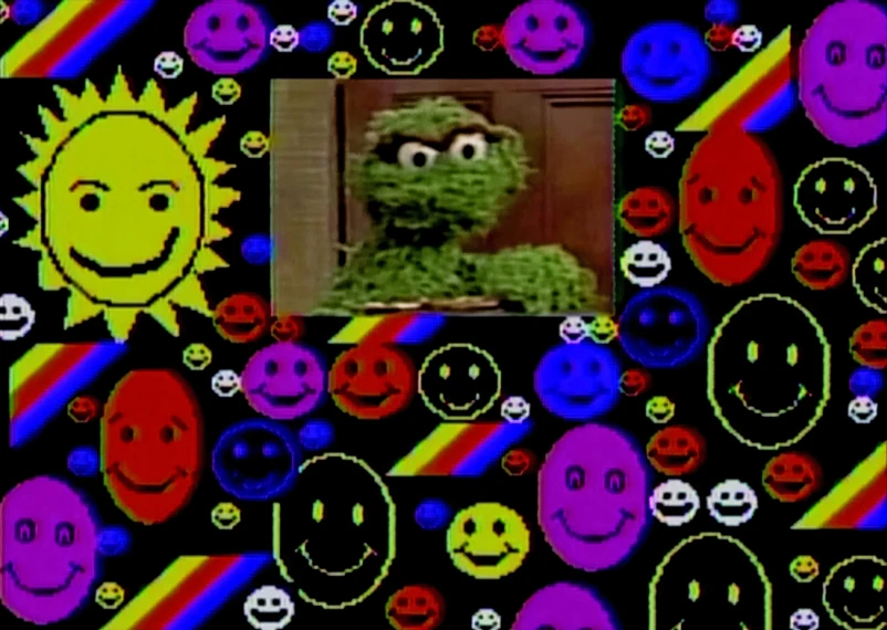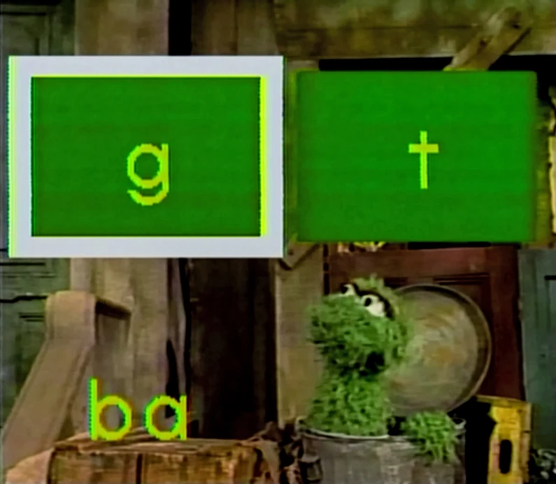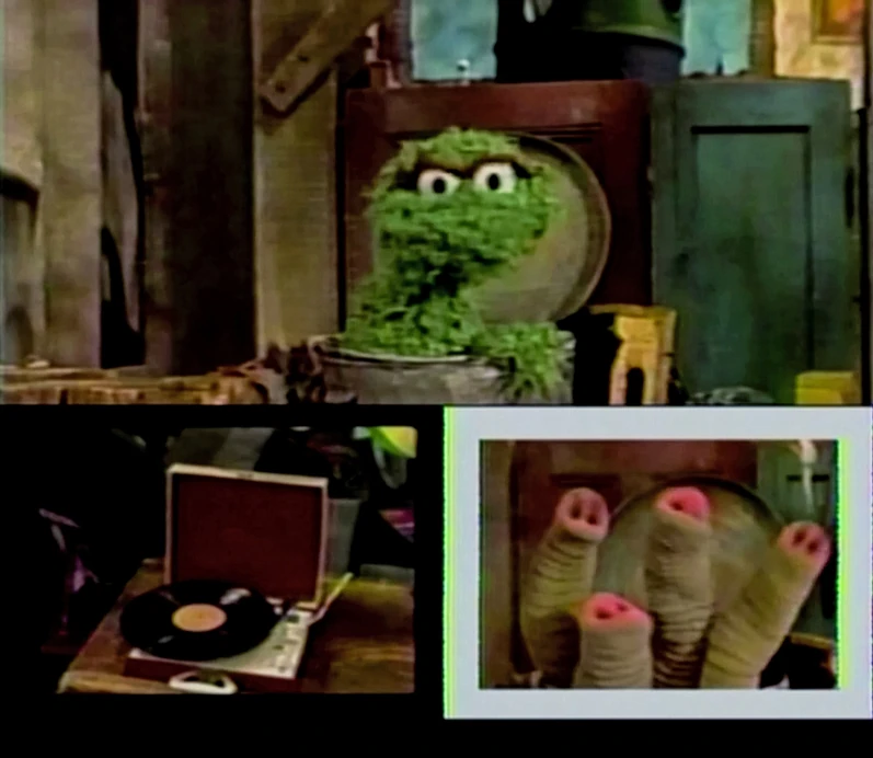 SCENE 1 | Oscar the Grouch is none too happy with the cheerful pixelated screen that surrounds his trash can. He asks the player to erase it by wiggling their joystick and passes the time by drumming away on his trash can lid. If the controller is left idle, Oscar uncovers the screen himself. |