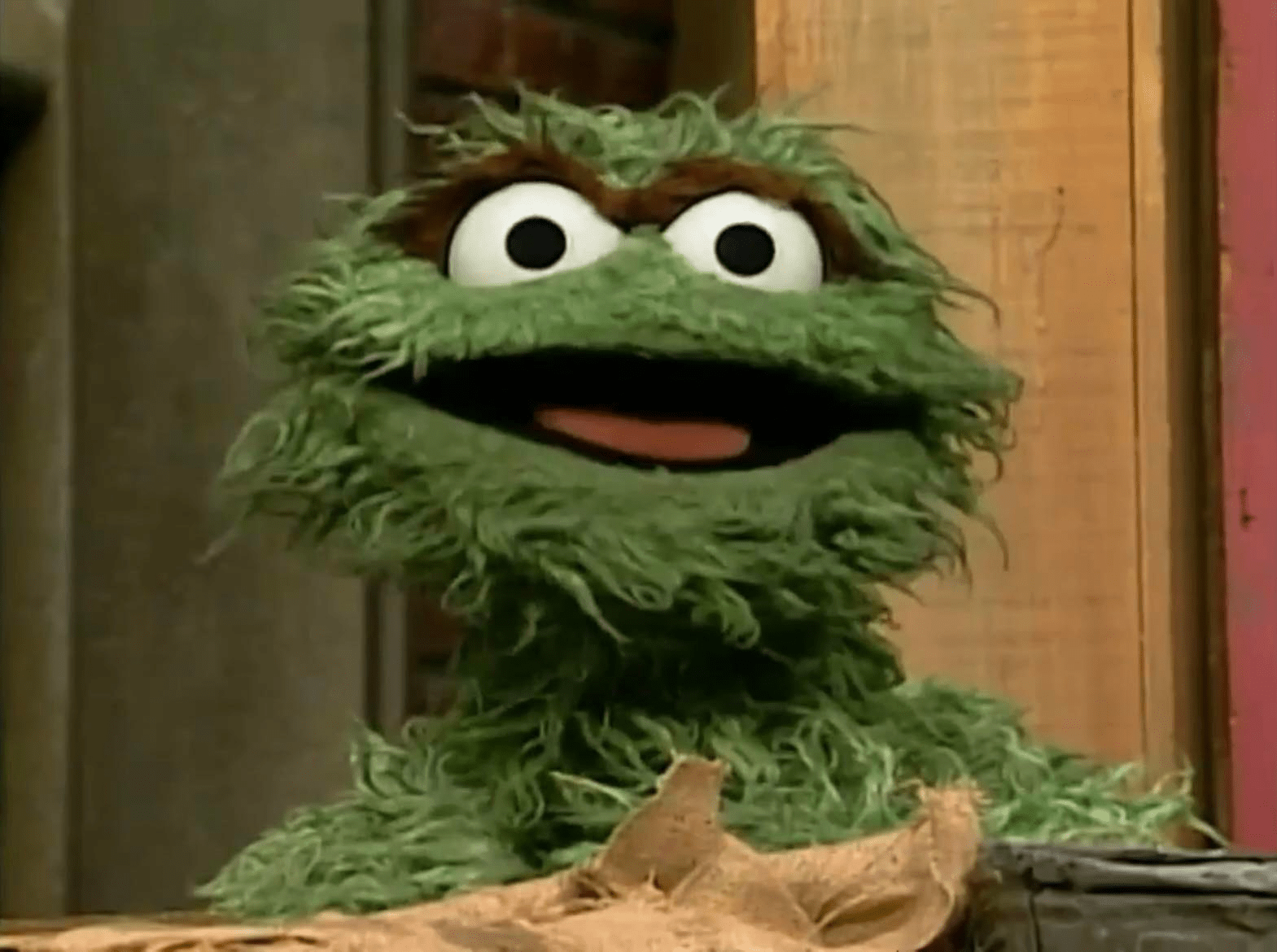 For the second season, Oscar's eyebrow has reverted back to brown and his head has been remodeled into its final shape. Although the puppet would be refurbished occasionally during this time, the design stayed consistent. In The Wisdom of Big Bird, Spinney said that the current Oscar's eyebrow (as of the time the book was written) is still the same piece of fur used for the original orange Oscar puppet. Oscar's tongue would noticeably get darker over time as well. |