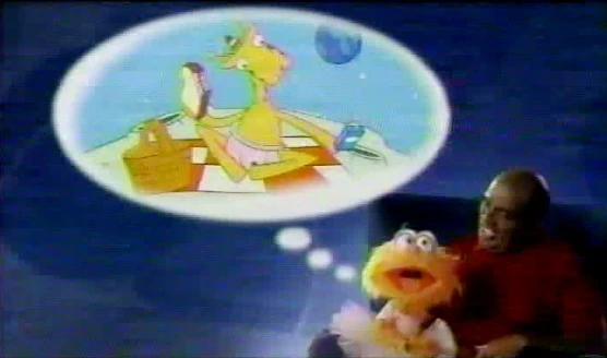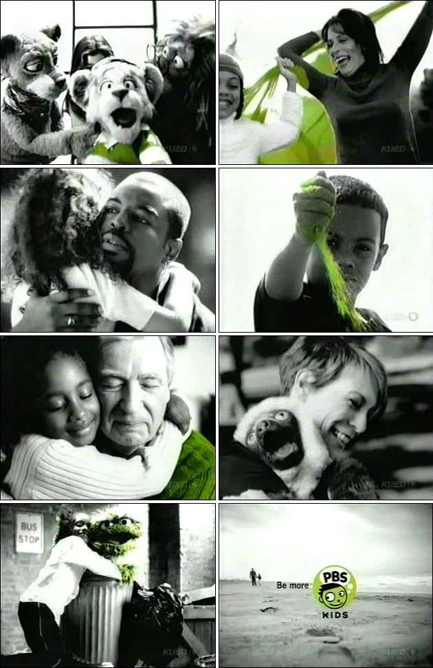 Early 2000s | One "Be More" interstitial features Oscar along with Liam Neeson, Jane Kaczmarek, LeVar Burton, Jamie Lee Curtis, Virginia Madsen, Fred Rogers, Raquel Castro, characters from Between the Lions, Zoboomafoo, Clifford the Big Red Dog, Arthur, and a bunch of kids. The interstitial plays to the song "You Gotta Be" by Des'ree. An alternating version of the promo, with different footage, features "Only You", performed by the "New Rhythm and Blues Quartet" (NRBQ). This interstitial was filmed and aired before Fred Rogers' passing in early 2003. |