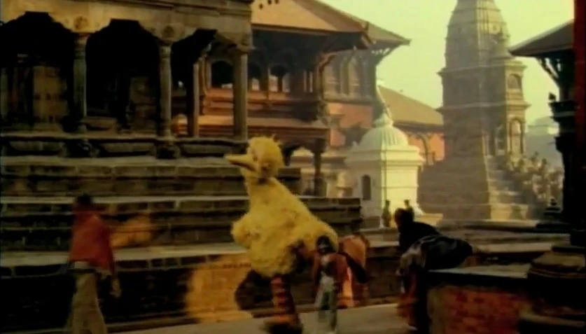 2002 | Big Bird appeared in a one minute sequence in which he appears at the home of a child and ventures to the Berlin Wall, a landing on the Moon and other locations. The announcer says "TV can be a child's window to the world. What will they see?" Rachel Portman's score for The Cider House Rules is used. |