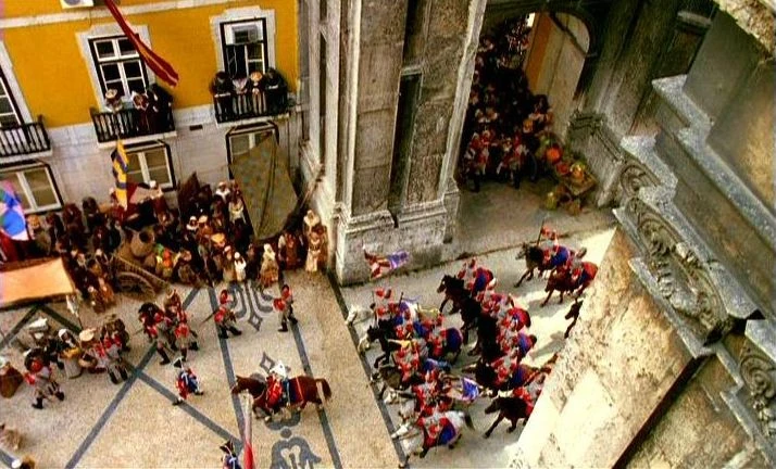 The scenic beauty of Portugal was used extensively in the Jim Henson's Creature Shop film Gulliver's Travels, shot primarily in Lisbon. The beaches were used for exteriors, the National Palace of Ajuda as the palace of Lilliput, and the palace of Queluz was used for the Queen of Brobdignag's abode. Rua Augusta (one of the main streets of Lisbon) was used for the sequence where Gulliver is brought into Lilliput, with the street's famous arch and pavement decorations on display. The library of the National Palace of Marfra was used as the Lilliputians' Great Chamber of War.