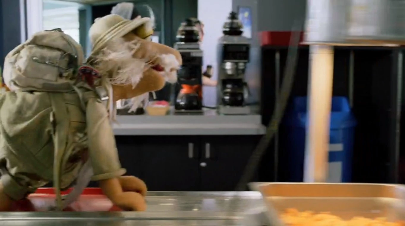 Episode 106: The Legend of Icy Joe | At a ski resort, Matt goes "sledding" in the cafeteria on a tray. He sends back to the Fraggles that same tray. |