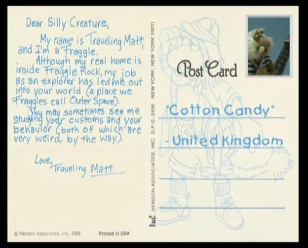 Postcards are messages sent by Uncle Traveling Matt back to his nephew, Gobo. Matt's messages describe the interesting things he's discovered in Outer Space — often misunderstanding what he's seen, and interpreting it from his own Fraggle point of view.