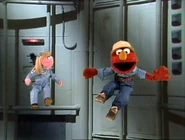 He then changes into a construction worker's outfit, only for Prairie to tell him the role is unnecessary too. He finally changes into a farmer, unaware that there's no animals to tend to or ground to plant things in. Prairie sighs and tells him to simply enjoy the ride while he's here. Elmo insists they could still use a farmer, pointing to the cow floating by them.