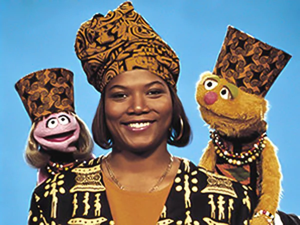 Queen Latifah with Prairie Dawn and Merry Monster from her Sesame Street appearance in 1992.