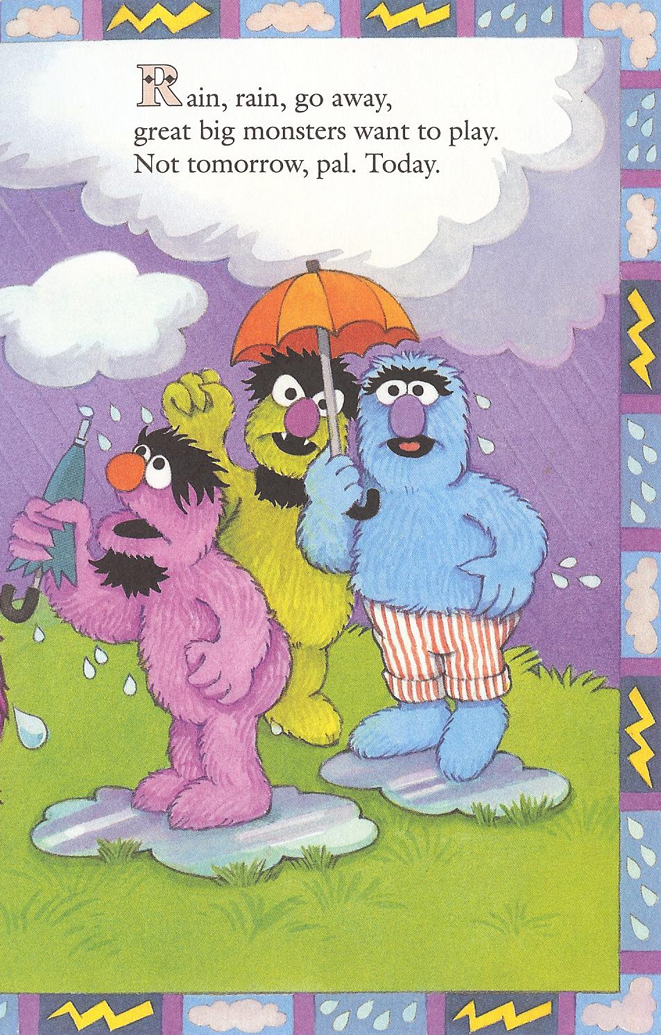 - Sesame Street monsters, including Herry Monster want the rain to end so they can play in Sesame Street's Mother Goose Rhymes.