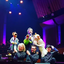 Kermit, Miss Piggy, Floyd, Pepe, Gonzo, Scooter, Walter, Fozzie, Animal and two chickens in The Muppets All-Star Comedy Gala at the Just for Laughs festival (2012). |