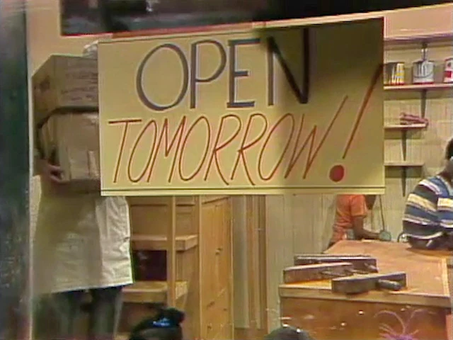 Episode 1413 The residents of Sesame Street cooperate in washing the front window, painting the interior, and sorting lumber. Poco Loco takes advantage of the shop's newly-installed sink. |