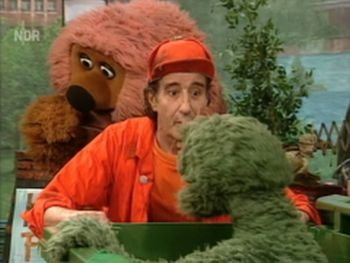 Rolf Zacher (1941-2018) was a German actor known for his work in film and television, often playing small-time criminals. He guest starred on Sesamstrasse in 1998, appearing in Folge 1896 as a garbage man who brings an organic wastebin to the courtyard. He also appeared in the 25th anniversary special Am Anfang War Das A: 25 Jahre Sesamstrasse.